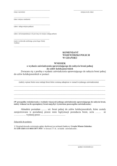 Zwracam się z uprzejmą prośbą wydania 5 szt. zaświadczeń uprawniających do nabycia broni palnej do celów KOLEKCJONERSKICH w ramach posiadanej decyzji administracyjnej WPA.642-……………………… w postaci:
